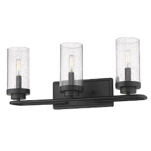 Transitional in design, Holden is a collection of sophisticated fixtures with slightly playful silhouettes. Sleek and graceful slender tubes defy gravity to hold tall cylindrical glass shades atop metal cups. With its mid-century modern aesthetic and two finish options, the series was created with a variety of interiors in mind. Choose between a stately plated aged brass finish, or a striking matte black. When illuminated, the clear seeded glass softly diffuses the light cast by the slim candelabras for a radiant look. This 3-light bath vanity is UL approved for damp locations.