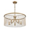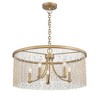 The design of the Marilyn collection is evocative of the glamour and romance of the 1920s. Shimmering gold chains dangle dramatically suspending beads of crystals or pearls. The gold strands create the illusion of full drum shades, shielding slender arms and elegant candelabras. This glamorous design creates a look of timeless elegance that works beautifully in eclectic environments. The Peruvian Gold finish complements a variety of interiors. This 5-light chandelier creates a stylish focal point and is comfortably sized for intimate dining and living areas.
