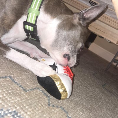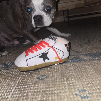 [This review was collected as part of a promotion.] I purchased this dog toy online. It looks like a designer dog sneaker and pretty much looks like the real deal. I have 2 Boston Terriers. One of them is toy obsessed and the other is obsessed w stealing our shoes, but doesn't really care too much for chew toys. I gave my shoe dog this toy to see how he would react. He was actually obsessed with it. I think he thought it was an actual shoe. He kept sucking on the laces (which look and feel real) and would play tug-of-war if we tried to take it out of his mouth. My toy obsessed dog tried to take it from him, but he couldn't get it away. This is a keeper! After my dog has chewed all the stuffing out of it, I will probably need to get another one. It's a bit pricey for a dog toy, but if my dog loves it this much then it's worth it! I received an incentive to write this review.