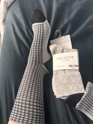 [This review was collected as part of a promotion.] These Goldtoe Signature Collection socks fit true to size and feel amazing all day. The cuff is just right — snug but not tight — and they stay up on my calf without sliding down. The medium-weight fabric is soft, breathable, and has just enough cushioning for comfort in sneakers, boots, or casual shoes. I love the elegant Damask and Houndstooth patterns, and even after several washes, they still look and feel like new. Durable, stylish, and super comfortable — perfect for work, errands, or relaxing at home.