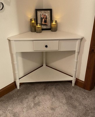 I selected this cream colored corner table to fill the space between the bathroom and the bedrooms. It was very easy to put together compared to other furniture brands that I have purchased from Target and Wayfair. It seems to be sturdy, at least sturdy enough to meet my needs, as this table will only be used for decoration. I took two pictures to show the cream color in different lighting. The darker picture is with only the hallway light on above the table. The brighter picture is with the hallway light and the camera flash on.