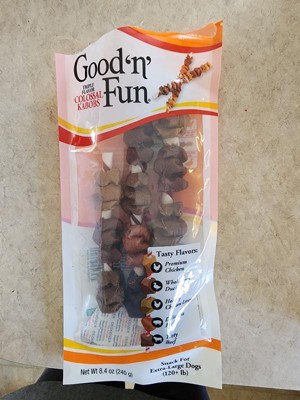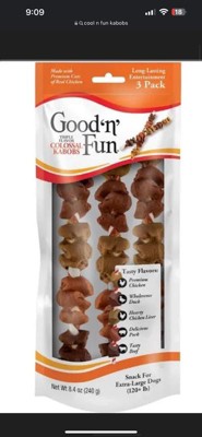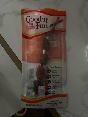 [This review was collected as part of a promotion.] We let our dog try the Good n Fun Triple Flavor Colossal Kabobs and he loved it. I dont think its the healthiest treat but for an occasional treat its good. I was worried at first because it was messy with pieces all over his dog bed but he liked it so much he cleaned up every crumb.