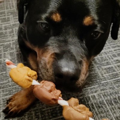 [This review was collected as part of a promotion.] Love these kabobs! The size of them is perfect for my large dog and my puppy couldnt resist wanting one as well. He loves all the different flavors and spends about an hour eating them. Theyre nice and dense which allows them to take their time. The packaging was really nice and getting 3 in a package was awesome! Would highly recommend!