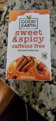 Good Earth Sweet & Spicy Herbal & Black Tea Caffeine Free has bursts of sweet orange that tangle with spicy cinnamon. The natural sweet flavors and spice notes play mysteriously together. This kosher herbal tea is free from artificial colors, flavors and preservatives. Each box of good earth sweet & spicy herbal & Black Tea contains 1.43 oz. of product.