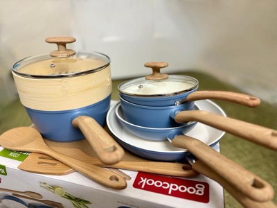 Bring high-quality cookware to your home kitchen with the GoodCook Healthy Ceramic 10-Piece Cookware set includes 7" and 9.5" Fry pans, 1.25-quart and 2-quart sauce pans with lids, a bamboo steamer that fits in 2qt Sauce pan, an egg pan, and 2 wood tools (spoon and slotted turner) is the ideal set that can be used to sauté, sear, simmer, roast, and more with ease. Our Healthy Ceramic cookware has a durable, quality titanium infused ceramic nonstick surface for easy cleanup and a quick release from even the stickiest of foods. Cook with less oil and butter. Sophisticated interior finish, light beige with gray speckles. Made of recycled aluminum for a healthier tomorrow, our coating is toxin free made without PFAS, PFOA, PTFE, LEAD and CADMIUM. Forged vessel for long-lasting durability with a heavy gauge, sturdy aluminum body for fast and even heat with stunning and trendy matte light blue. The tempered glass lid allows you to see into the sauce pan while still keeping food covered. Wood-look soft touch Bakelite handle resists burning and stays cool to keep your hands safe. The molded ergonomic design gives you better control and greater comfort even after extended use. Safe for all stove tops, including induction, for even and consistent heat distribution. The bamboo steamer fits the 2qt sauce pan that can be used to steam vegetables, dumplings, etc. this vessel allows you to continue your healthy lifestyle. For over 30 years, GoodCook has created the tools that have made life in the kitchen easier and more enjoyable. As we’ve grown, we strived to stay on trend and continually incorporate more function and value into our kitchenware products. We take pride in the fact that GoodCook products are being used every day, and that our name is recognized as a helpful resource supplying products, recipes and inspiration for home cooks across America.