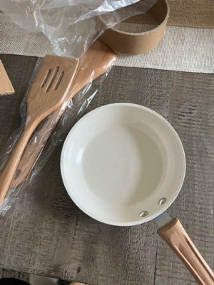 - 10-Piece Cookware Set: Includes 7" and 9.5" fry pans, 1.25-quart and 2-quart sauce pans with lids, a bamboo steamer that fits in 2qt sauce pan, an egg pan (not induction capable), and 2 wood tools (spoon and slotted turner)