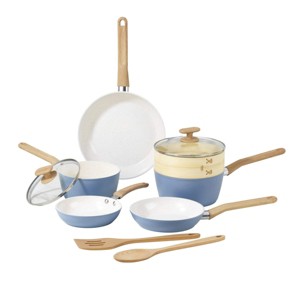 [This review was collected as part of a promotion.] This GoodCook Healthy Ceramic Titanium- Infused 10 piece cookware set is absolutely AMAZING. I did not think that I could be this excited about kitchen products! FIrst off, the color of this set is pale blue and seriously so beautiful. It can lighten up any kitchen or bring a touch of color that is subtle and not overwhelming. I am in love with how it looks. The lids have these wooden looking handles and it is the perfect touch to any kitchen set. On to the quality of this entire set, just WOW. Even the utensils alone are impressive. They are thick but not heavy, smooth, easy to use and just all around look nice. The new technology used to make it so you can cook with less oil or grease is amazing. It seriously works and I am so happy that even a cookware set can add an aspect of healthy living and eating. I wish I could give this product 10 stars instead of just 5. I am recommending this to EVERYONE! I am so impressed.