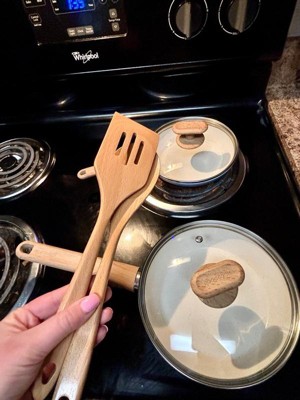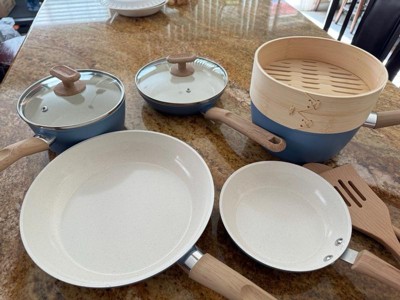 [This review was collected as part of a promotion.] Love this set, I was really impressed with the quality, they have a nice solid construction, yet are light weight. Key pluses * The handles fit really well in my hand. * They clean up so easily, no sticking without having to add anything to the pans first * A good range of sizes, I love the smallest frying pan for cooking an egg or making a sandwich * The 2 utensils are amazing, they are so smooth instead of a rough wood. They are simple to keep clean and work so well * The bamboo steamer is a nice addition, it’s a good size for one or two servings, I use it to quickly steam some fresh vegetables. * They evenly heat up on my gas stovetop, no hot spots, and have a nice solid bottom Overall this is a perfect starter set for a single person or couple, or a nice addition to what you already have. This works great for my husband and myself, I would have to add a few larger sized pans and pots if I was using these for the whole family, but you can’t beat this quality with this many pieces for the price. I really do love them all and will be using each piece regularly.