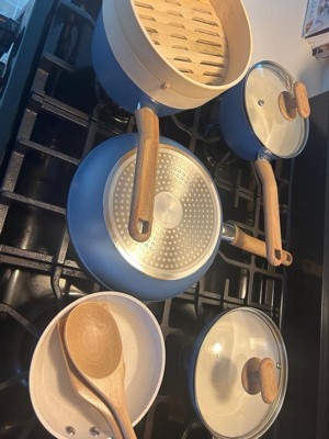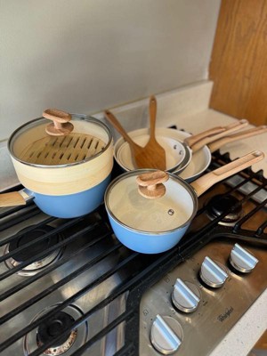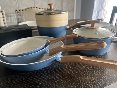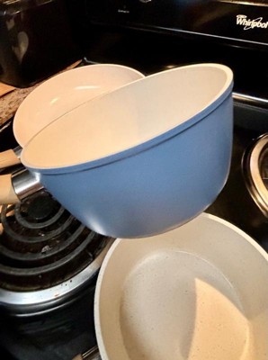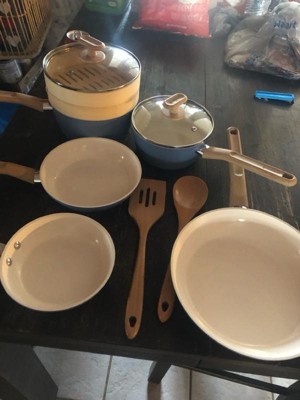 [This review was collected as part of a promotion.] I love love this cookware set! Especially the middle pan - I’ve used it every day since I’ve gotten it!! I am not by any means a good cook so I just need the basics and this cookware set does exactly that. 3 pans of varying sizes and 2 pots is perfect for someone who is looking for a quick and easy meal and ESPECIALLY wants easy cleaning. First off - the blue color is so unique in my kitchen. And let’s talk about the mini pan - it is the most adorable thing ever, it even has a small handle but more than anything it is perfect for when I want to fry an egg.The two bigger pans are very useful - I especially have been using the middle one the most just for a quick stir fry or scrambled eggs for one person. The pots are the perfect sizes for pasta and quick sauces. Overall, I am loving this cookware set - the shapes, the sizes, and the easy cleaning is the perfect starter set.