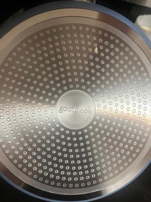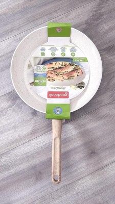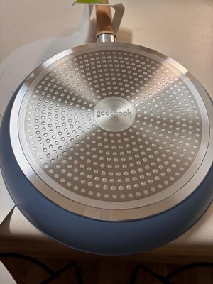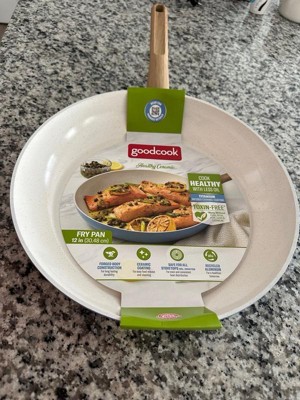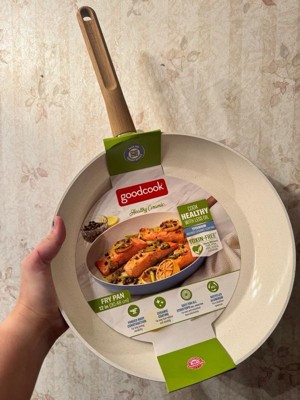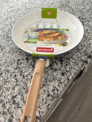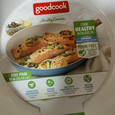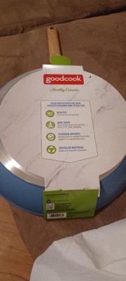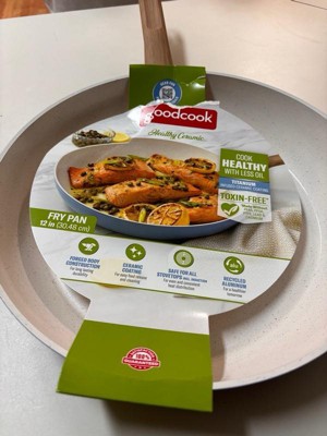 Bring high-quality cookware to your home kitchen with the GoodCook Healthy Ceramic 12" Fry Pan. Designed with home cooks in mind, our Healthy Ceramic cookware has a durable, quality titanium infused ceramic nonstick surface for easy cleanup and a quick release from even the stickiest of foods. Cook with less oil and butter. Sophisticated interior finish, light beige with gray speckles. Made of recycled aluminum for a healthier tomorrow, our coating is toxin free made without PFAS, PFOA, PTFE, LEAD and CADMIUM. 10" diameter surface that is ideal for a variety of cooking applications, from frying personal omelets to sautéing vegetables and simmering sauces. Forged vessel for long-lasting durability with a heavy gauge, sturdy aluminum body for fast and even heat. The ergonomic wood-look Bakelite handle stays cool to offer a secure grip during cooking and is soft touch. Plus, the matte light blue colored silicone lacquer exterior is both durable and stylish to complement your kitchen. This versatile pan allows you to sauté, sear, simmer, fry, and more with ease. Safe for all stove tops including induction for even and consistent heat distribution. For over 30 years, GoodCook has created the tools that have made life in the kitchen easier and more enjoyable. As we’ve grown, we strived to stay on trend and continually incorporate more function and value into our kitchenware products. We take pride in the fact that GoodCook products are being used every day, and that our name is recognized as a helpful resource supplying products, recipes and inspiration for home cooks across America.
