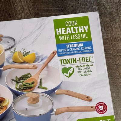 [This review was collected as part of a promotion.] Fantastic set of non toxic titanium cookware, holds up well to heavy use and eggs and sticky foods just slide right out! I was really happy to see that this cookware is safe but also coated with titanium! The wooden look gives an old school farmhouse vibe but is also quite sturdy. I appreciated the wooden spatula and serving spoon especially so that they don't scratch the coating. Love the large deep frying pans the most, they are great for making big meals.