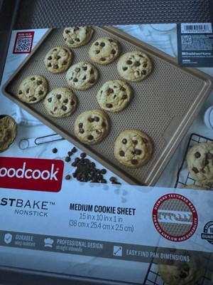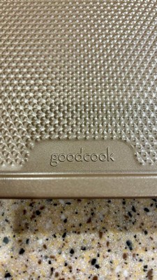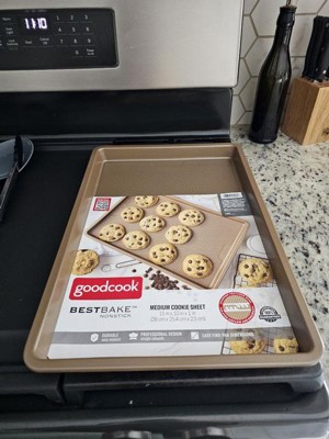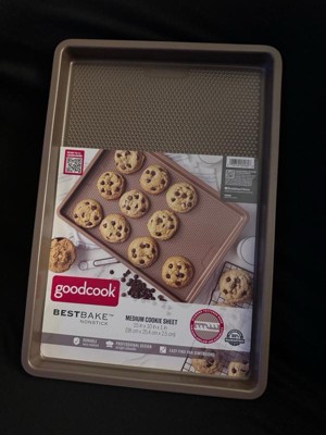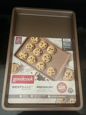 Bring quality bakeware to your home kitchen with the GoodCook BestBake Textured Large Cookie Sheet. Designed with experienced bakers in mind, this premium baking sheet ensures a perfect bake every time for larger batches of your favorite recipes, from cookies and other desserts to sheet pan dinners. The textured, diamond-pattern surface finish promotes proper airflow for even heating without hotspots and offers additional stability and strength. Scratch-resistant nonstick coating, this cookie sheet provides excellent release while also making clean up quick and easy. This nonstick baking sheet measures 15" x 10" x 1" and is made with carbon steel and bronze finish to resist warping and offer high quality baking for years to come.