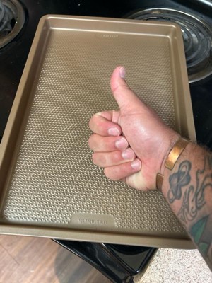 [This review was collected as part of a promotion.] Super durable pan cleaning was super easy size is absolutely perfect to do a quick thing of cookies. Cookies came out perfect the textured bass had no effect on how well the food was cooked