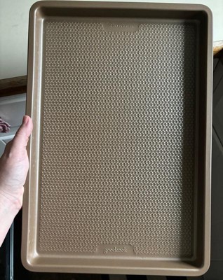 [This review was collected as part of a promotion.] I really enjoyed this cookie sheet. I like that it’s textured to allow airflow. The size is perfect for smaller households and individual baking. It feels like it will last a long time based on how heavy and sturdy it is. It’s easy to wash because the water doesn’t get trapped on the fold over part underneath. It baked my cookies perfectly, which makes me super happy.