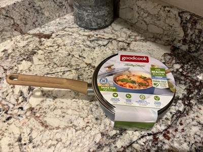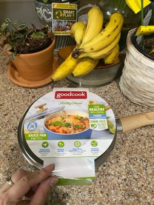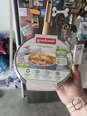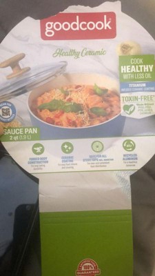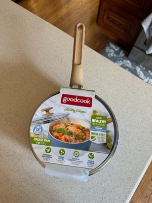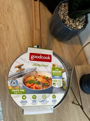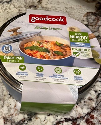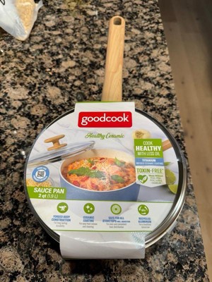 Bring high-quality cookware to your home kitchen with the GoodCook Healthy Ceramic 2 Quart sauce pan. Designed with home cooks in mind, our Healthy Ceramic cookware has a durable, quality titanium infused ceramic nonstick surface for easy cleanup and a quick release from even the stickiest of foods. Cook with less oil and butter. Sophisticated interior finish, light beige with gray speckles. Made of recycled aluminum for a healthier tomorrow, our coating is toxin free made without PFAS, PFOA, PTFE, LEAD and CADMIUM. This sauce pan is ideal for a variety of cooking applications, from simmering soups and sauces to cooking pasta and rice. Forged vessel for long-lasting durability with a heavy gauge, sturdy aluminum body for fast and even heat. The ergonomic wood-look Bakelite handle stays cool to offer a secure grip during cooking and is soft touch. Plus, the matte light blue colored silicone lacquer exterior is both durable and stylish to complement your kitchen. This versatile pan allows you can sauté, boil, simmer, bake, and more with ease. Safe for all stove tops including induction for even and consistent heat distribution. Tempered glass lid allows you to see into the sauce pan while still keeping food covered. For over 30 years, GoodCook has created the tools that have made life in the kitchen easier and more enjoyable. As we’ve grown, we strived to stay on trend and continually incorporate more function and value into our kitchenware products. We take pride in the fact that GoodCook products are being used every day, and that our name is recognized as a helpful resource supplying products, recipes and inspiration for home cooks across America.