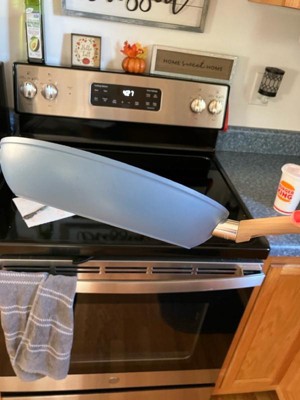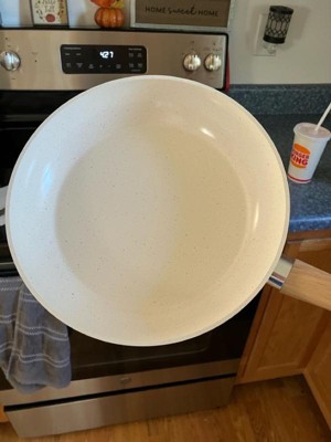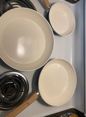 Our Healthy Ceramic 3-pack Fry Pan Set includes the three most useful sizes to sear, sauté or fry your meats, fish, eggs and more. Use the small pan for personal omelets or the medium one for a meal for two. The large pan is perfect for a family dinner. The non-stick ceramic surface is titanium infused for durability and completely free of toxic chemicals like PFOA or PTFE, while allowing for less oil when cooking to ensure healthier eating. Need a go-to pan around the kitchen? Our Healthy Ceramic is the answer, with a durable forged aluminum vessel that heats quickly and evenly every time and give you years of service. Contemporary design elements include an ergonomic wood-look handle with easy grip thumb rest, speckled cream interior and matte blue exterior. The induction friendly base is safe to use with any stovetop, so this cookware makes the perfect gift too.