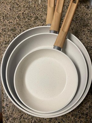 [This review was collected as part of a promotion.] This GoodCook 3 piece set is the perfect set. Whether it's a starter set or a set to expand your current set with an 8, 10, and 12 inch option. The handles are stunning. They have a wood simulated look that makes them look classy. They heat even to cook the food to perfection. And cleaning? A dream .. truly. I was super impressed and have added these into permanent use in our home kitchen ❤️