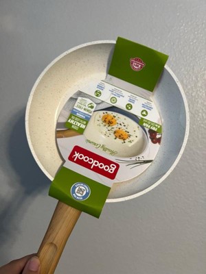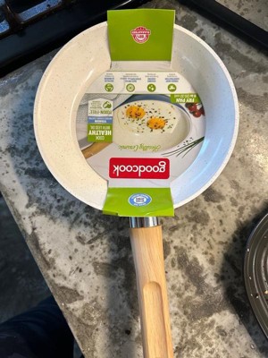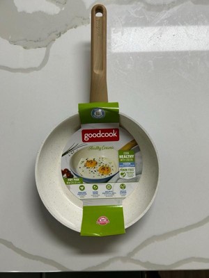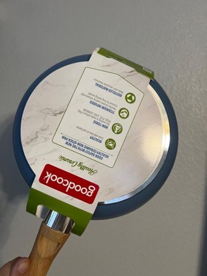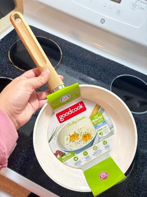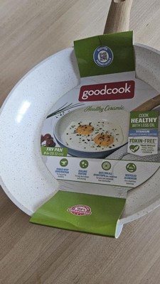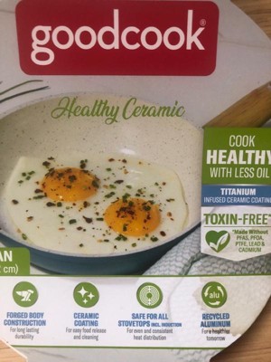 Bring high-quality cookware to your home kitchen with the GoodCook Healthy Ceramic 8" Fry Pan. Designed with home cooks in mind, our Healthy Ceramic cookware has a durable, quality titanium infused ceramic nonstick surface for easy cleanup and a quick release from even the stickiest of foods. Cook with less oil and butter. Sophisticated interior finish, light beige with gray speckles. Made of recycled aluminum for a healthier tomorrow, our coating is toxin free made without PFAS, PFOA, PTFE, LEAD and CADMIUM. 8" diameter surface that is ideal for a variety of cooking applications, from frying personal omelets to sautéing vegetables and simmering sauces. Forged vessel for long-lasting durability with a heavy gauge, sturdy aluminum body for fast and even heat. The ergonomic wood-look Bakelite handle stays cool to offer a secure grip during cooking and is soft touch. Plus, the matte light blue colored silicone lacquer exterior is both durable and stylish to complement your kitchen. This versatile pan allows you to sauté, sear, simmer, fry, and more with ease. Safe for all stove tops including induction for even and consistent heat distribution. For over 30 years, GoodCook has created the tools that have made life in the kitchen easier and more enjoyable. As we’ve grown, we strived to stay on trend and continually incorporate more function and value into our kitchenware products. We take pride in the fact that GoodCook products are being used every day, and that our name is recognized as a helpful resource supplying products, recipes and inspiration for home cooks across America.