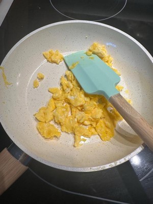 [This review was collected as part of a promotion.] It’s small but perfect size for omelette which I’ll primarily be using this for because I mainly use stainless steel. I don’t like the wooden handle. I feel like it will not last as long and you definitely not want to put this in the dishwasher. It does work well the non stick surface is great