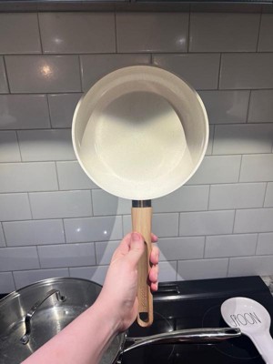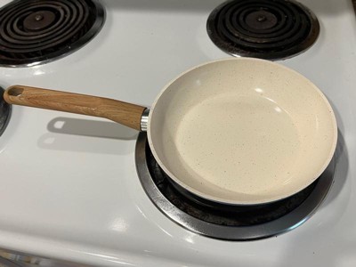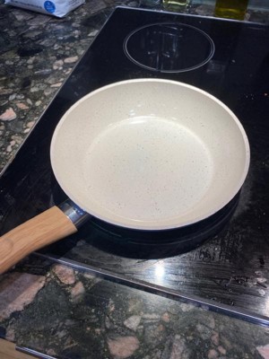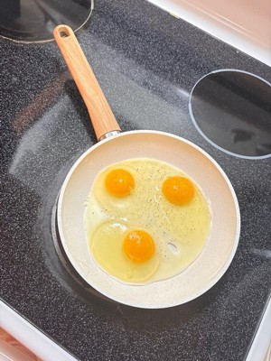 [This review was collected as part of a promotion.] I love the color of this pan. This size is a good size for cooking over easy eggs in the morning. The nonstick works great and I had no issues cleaning the eggs out after using the pan. The handle feels nice and sturdy with a faux wood grain pattern.