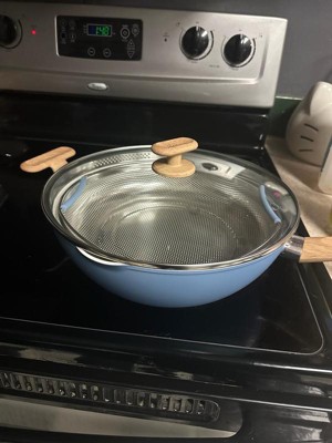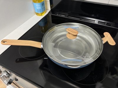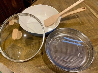 Our versatile Healthy Ceramic All-in-One Pan, with the included steamer basket, spatula, and tempered glass lid, can perform multiple cooking functions including braising, frying, boiling, sautéing, searing and stewing. The basket can be used for steaming and straining, while the pan is more than attractive enough to serve at the table. The wooden spatula compliments the non-stick, titanium infused ceramic surface which is completely free of toxic chemicals like PFOA or PTFE, while allowing for less oil when cooking to ensure healthier eating. Need a go-to pan around the kitchen? Our Healthy Ceramic is the answer, with a durable forged aluminum vessel that heats quickly and evenly every time and give you years of service. Contemporary design elements include an ergonomic wood-look handle with built-in wooden tool rest, speckled cream interior and matte blue exterior. The induction friendly base is safe to use with any stovetop, so this cookware makes the perfect gift too.
