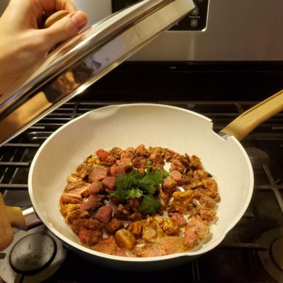 [This review was collected as part of a promotion.] Awesome plan that is deep enough to make one pot pasta and rice recipes. The steamer is a great feature and can be used for vegetables or even frozen dumplings. Great pan that has lots of different uses and is also suitable for living in a small space since it has so many uses. It’s also quite sturdy with a heavy bottom so it can be easily used with induction stoves.