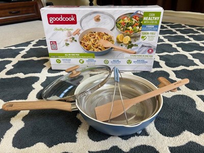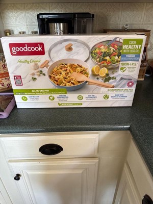 [This review was collected as part of a promotion.] Thank you to Influenster for this Good Cook Healthy Ceramic Titanium- Infused All-in - one Pan with Tempered Glass Lid in exchange for a honest review. . This versatile pan serves many purposes- - cooks and fries dishes and also steams vegetables. Its high sides prevent splatter and clean up is a breeze. Highly recommend