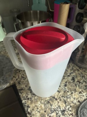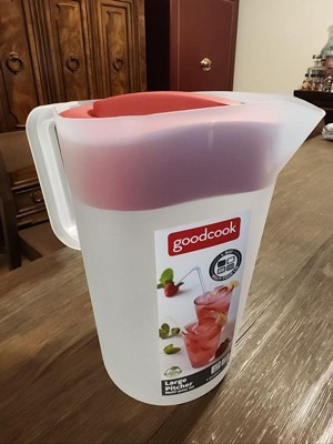 Keep your beverages fresh and cool with the GoodCook Straining Pitcher with Multi-Pour Lid. This covered pitcher features a 1 gallon capacity and is great for storing lemonade, iced tea, juice, mixed drinks, water, and more in the refrigerator. The 4-way lid design features three pouring options - open, pulp strainer, and ice filter - with a closed option to prevent spills and keep beverages tasting their best. The square lid shape stays in place and does not twist to unwanted positions while in use. The integrated spout provides a precise pour, while the long rounded handle makes it easier and more comfortable to use. It also features embossed measurement markings in quarts and liters along the side of the pitcher for convenience. When you're ready to serve your drinks, simply rotate the lid to the desired pouring or straining option. Made without BPA, the durable plastic construction with frosted clear and red finish is made to last and matches any kitchen decor. This drink pitcher measures 9.5" x 7.2" x 10.25" total for efficient storage in cabinets on shelves when not in use, and it is dishwasher-safe to make clean up a breeze. For over 30 years, GoodCook has created the tools that have made life in the kitchen easier and more enjoyable. As we’ve grown, we strived to stay on trend and continually incorporate more function and value into our kitchenware products. We take pride in the fact that GoodCook products are being used every day, and that our name is recognized as a helpful resource supplying products, recipes and inspiration for home cooks across America.