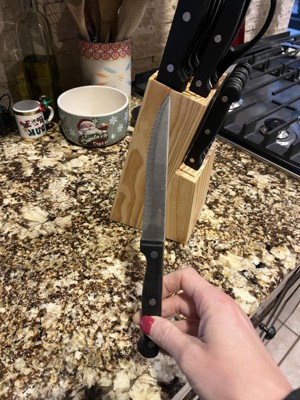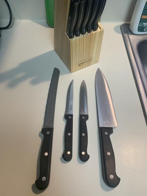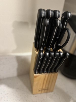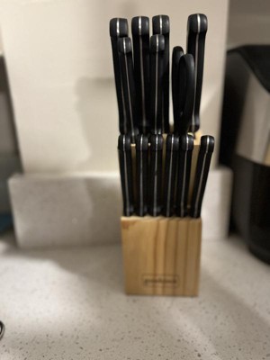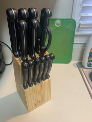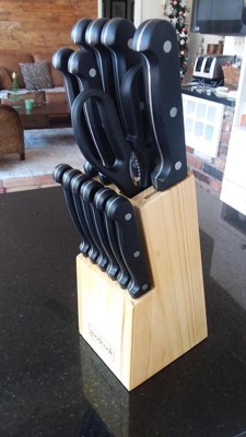 Our GoodCook Knife Set includes every knife you'll need, conveniently stored in a natural wood block. The 14pc set includes an 8 inch chef's knife, 8 inch bread knife, 6 inch cooks knife, 5 inch santoku knife, 4.5 inch utility knife, set of 6 steak knives, 3.5 inch paring knife, and kitchen shears. The blades are made from high carbon stainless steel for a long lasting sharp edge. The blades have a full tang that goes the entire length of the handle, providing stability, balance and durability anchored with triple rivets. The contoured ABS handles provide excellent comfort and control. All of the knives can be safely stored in the included natural wood block, which securely sits on your countertop with its non-slip feet.
