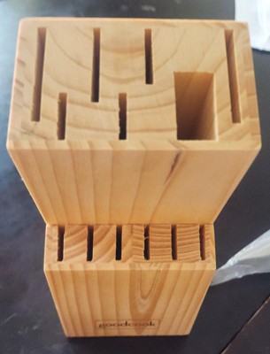 - Natural wood block for safely storing knives while not in use. The compact block sits securely on countertop with non-slip feet