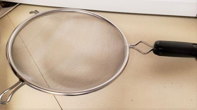 - Wire frame has two hooks to rest strainer onto rims of bowls and cookware.