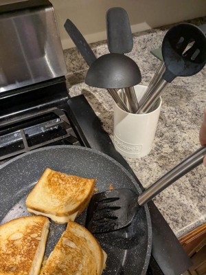 Our GoodCook Ready Tool Set includes 7 essential tools, along with a crock for convenient storage on the counter. The ladle, skimmer, slotted spoon, slotted turner, basting spoon, and turner are all made from durable stainless steel with nylon heads. The scoop spatula and spatula are made of stainless steel with a silicone flexible head. Each are 8.5 inches long, to keep your hands further from the heat of the stove. The nylon heads are heat-safe to 400°F and safe for nonstick cookware. While the spatula is safe for nonstick surfaces, and is heat-safe to 450°F. All items are easy to clean and top rack dishwasher safe. The ceramic crock is perfect to keep on your counter to house your tools when they are not in use.