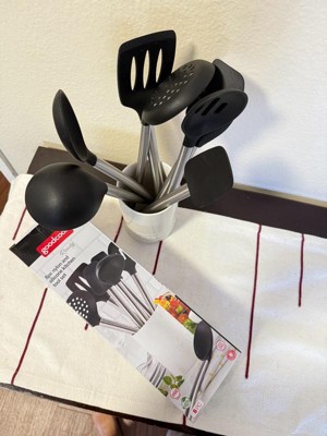[This review was collected as part of a promotion.] Beautiful little set of kitchen utensils that include a sleek holder. Made from silicone and nylon which makes them safe to use in your non-stick pans. So far they seem durable and clean easily in the dishwasher. It also looks so sleek on your kitchen counter. Has every utensil you need to start cooking, perfect for young adults starting out or a quick kitchen refresh.