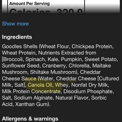 goodles shells (wheat flour, chickpea protein, wheat protein, nutrients extracted from [broccoli, spinach, kale, pumpkin, sweet potato, sunflower seed, cranberry, chlorella, maitake mushroom, shiitake mushroomi), cheddar cheese sauce (water, cheddar cheese [cultured milk, salt], canola oil, whey, nonfat dry milk, milk protein concentrate, disodium phosphate, salt, sodium alginate, natural flavor, sorbic acid, xanthan gum).' '