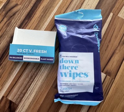 goodwipes V. Fresh Flushable Down There Feminine wipes are the self-care must have you didn't know you couldn't live without. That time of the month? Need to hit the reset button post-sweat sesh? Feelin a little flirty, if you will? ;) We’ve got your… front! Nothing feels better than clean - which is why we’ve created our gently cleansing, perfectly pH-balanced (for your vulva!), suspiciously soft down there wipes. They’re a hoorah for your hoo-ha!