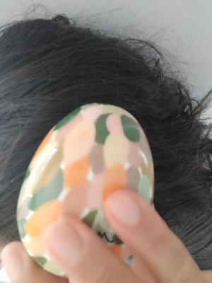[This review was collected as part of a promotion.] I’ve been using this massaging scalp brush for two weeks. I have very thick hair and sometimes have scalp build up because it can be difficult to really get into all the areas with my fingers while shampooing. This has helped so much. The bristles are soft but durable and are mixed in length (long, medium and short) to really get into all the areas of my scalp. It feels so good while using it! I mostly use it while in the shower but it does feel good to use it from time to time while my hair is dry. As for the design, it is so pretty! Love the mix of colors. It is about the size of my palm and easy to keep a good grip while using. Overall it is helping my scalp and hair roots feel much better. Thank you!