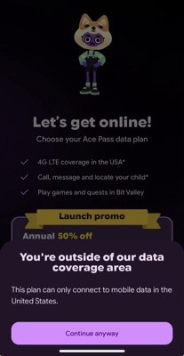 - **Ace Pass data plan required. Ace Pass LTE services are not available in Alaska or US territories. Works with most phones running Android 11.0 or newer or iOS 15 or newer. Requires Wi-Fi for setup. Setup for users under 13 requires parent and child Google Accounts, and parent’s use of Fitbit Ace app on parent’s compatible phone. Older users require Google Account and Fitbit Ace app on user’s compatible phone. See g.co/fitbitace/info for more information.
