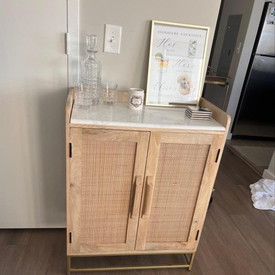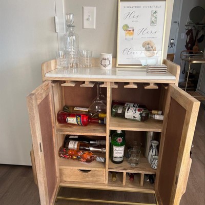 With an unbelievable list of features and a classic midcentury aesthetic, this cabinet is truly the quintessential home bar centerpiece. 2 cane panel doors open to reveal 4 shelves over 13” wide, 6 hanging racks for numerous wine glasses, 3 cubbies for storing bottles and a wooden drawer for corkscrews and utensils. A white marble top with black swirls is surrounded by a wooden border on 3 sides, creating a dream working station for casual and expert bartenders alike. The frame is constructed of solid mango wood in a natural finish and supported by an iron base in gold that holds the structure 6” from the ground. Beautiful craftsmanship and decked out storage; now all you need is the party.