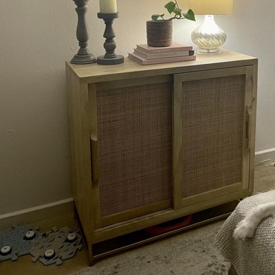 [This review was collected as part of a promotion.] This furniture piece is made out of such a smooth, natural piece of wood. It looked as if someone found some drift wood and hand crafted it into a gorgeous piece of furniture. I will say the tracks are hand carved divids in the frame, so when sliding the draws it can sound a bit rickety but that just adds to the natural component. The weaved rattan pattern on the front doesn’t seem like it would fray. The base is metal and did scratch my wooden floors so I definitely suggest using cushions. My self is filled with books at the moment so the extra weight won’t make it easy to be moved. This definitely smells like wood, but it’s refreshing.