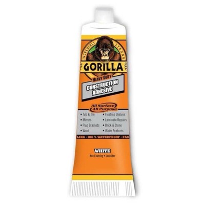 Gorilla Heavy Duty Construction Adhesive is a tough, versatile, all-weather adhesive. It’s 100% adhesive formula provides a long-lasting, heavy duty bond. We call it All Surface, All Purpose*. The durable, 100% waterproof formula holds up indoors and out and bonds virtually anything including subfloor, mirrors, trim, drywall, landscaping, bath surrounds, foamboard, marble and more!