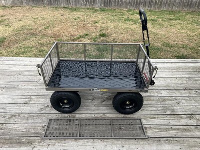 Rugged steel strength meets all-terrain performance in the Gorilla Carts 1200 lb Multi-Use Steel Dump Cart, built tough to handle your biggest outdoor hauling jobs. Designed with strength and performance in mind, this heavy-duty utility wagon delivers rugged reliability for gardening, lawn, backyard, farm, and landscape projects. Its durable powder-coated metal mesh bed measures 39.45 inches long by 22 inches wide, offering plenty of space for carrying tools, plants, soil, mulch, or firewood. With a maximum load capacity of 1,200 pounds, this cart is strong enough to handle demanding tasks, while the innovative frame design allows for quick and easy assembly.