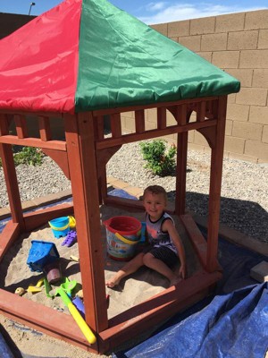 [This review was collected as part of a promotion.] Bought this last year on Amazon for my three year old grandson. He loves it. Nice to have a canopy to shade him from the Arizona sun. The canopy is not heavy material and often is blown off by the wind. Also faded easily but this is Arizona so I cannot complain. We now are starting into our second spring with it and my grandson can’t wait to get his sandbox fixed up so he can play. We are using Thompson stain and water seal to keep it in good condition. Also bought a new canopy cover for it.