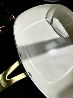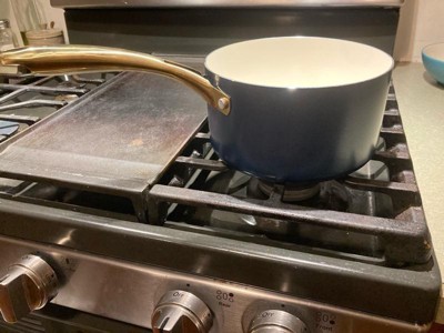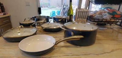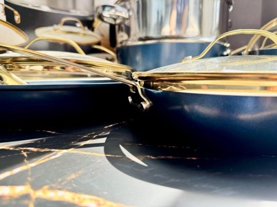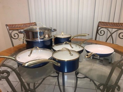[This review was collected as part of a promotion.] Beautiful look with the navy and the gold! Pans cook well, the ceramic style is awesome for non-stick, cleanup is a breeze. I was not a fan of the weight of the pans; the handles are way heavier than the pots and pans, would’ve preferred it to be more evenly distributed. Nice look, but more of a cheap feel.