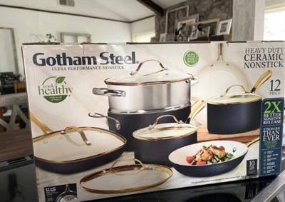 [This review was collected as part of a promotion.] The Gotham Steel 12-Piece Aluminum Ultra Performance Ceramic Nonstick Cookware Set in Navy with Gold Handles is truly a stunning collection. Photos don’t do this set justice—the navy and gold combination is gorgeous. This durable set includes 2 frying pans (with 1 lid), 3 pots (with 3 lids), 1 square pan (with 1 lid), and a stainless steel steamer. These pans not only elevate your kitchen’s aesthetic but also cut down cooking time, which has been a pleasant surprise. The nonstick coating makes both cooking and cleanup a breeze, perfect for someone like me who dislikes both tasks. The keep-cool handles are a nice feature, though I did notice they don’t always stay as cool as expected, so that’s something to keep an eye on. The fact that they are dishwasher safe and oven-friendly only adds to their convenience. Overall, this amazing cookware set combines style, efficiency, and ease of use—making it a great addition to any kitchen. I’m actually excited to cook now!!!