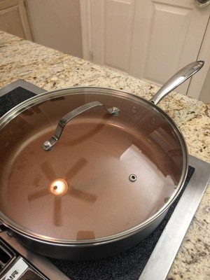 [This review was collected as part of a promotion.] I've been looking for a pan like this for a while. My mom has an older large, deep skillet and it's difficult to find a decent pan of this size. But I was very impressed by the Gotham Steel one. Both handles are sturdy (the small one is closest to the flame so it will get hot...check that before just touching it with bare hands). The clear lid is helpful to keep an eye on things while they're cooking (I recommend checking that handle also as it has prolonged heat exposure as well). Clean up is easy. All in all...a solid pan.