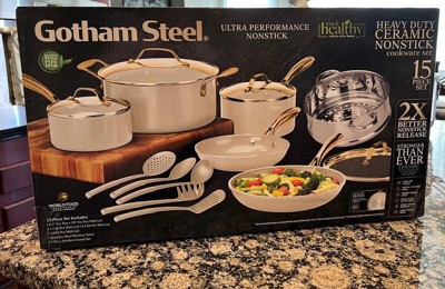 - GOTHAM STEEL NATURAL COLLECTION: Healthier cooking is easy with this nonstick ceramic cookware set. Pots and pans are designed to be 2x more durable, dishwasher safe, and oven safe up to 500ûF. Gold stay-cool handles allow you to go from stovetop to oven. But this set doesnÕt just cook good, they look good too, with a modern cream color that adds an elevated aesthetic to your kitchen.
