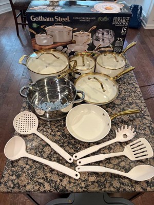 Gotham Steel Cream 15-Pc Ultra Nonstick Ceramic Cookware Set with Utensils with Gold Handles