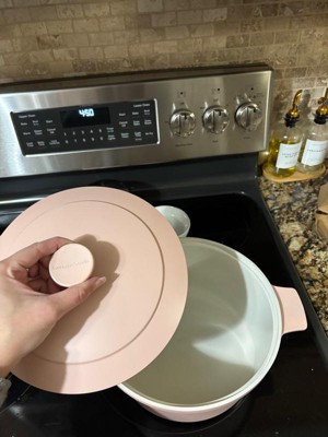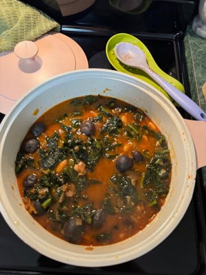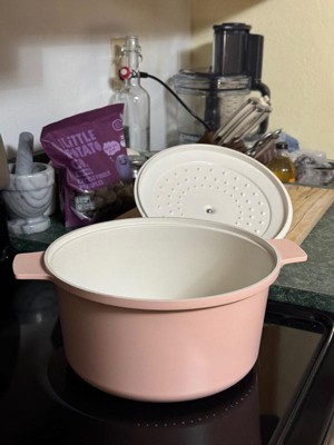 [This review was collected as part of a promotion.] This is a great size dinner pot for a family. I made a large batch of potato soup, it worked great and cleaned up so easily. The pot itself is very lightweight, lighter than any other pot of this size I’ve held. The pot heated evenly and I was able to sauté my vegetables quickly. Soup cooked up as expected, I like the lid. It has texture bumps that help condensation fall back into the pot, especially nice when lifting the lid. Cleanup was the quickest ever. No scrubbing or scraping dairy off the sides, it simply brushed right off with soap and water. The only con is how HOT the handles and lid get using it on the stovetop. Great little pot, lightweight, nice looking; just don’t forget to keep a potholder nearby.