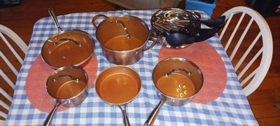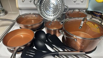 [This review was collected as part of a promotion.] So I got the copper set (like "boho rose gold" my kid said) but what a let-down that the included utensils didn't match and are instead a very flimsy black and silver. However, the quality of the pots, pans and lids, along with their appearance, make them feel super high-end. I'm skeptical of putting them in a 500 degree oven like the instructions suggest, but so far for daily use (eggs, soups, etc) I am thrilled! I was incentivized from Influenster with receiving this cookware set for my honest review and i love!