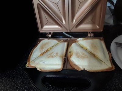 [This review was collected as part of a promotion.] Great product to make yummy sandwiches. It heats up quickly and toasts great. Fits two sandwiches nicely. As with all sandwiches makers it is a bit difficult to clean but the product is great and I love it!